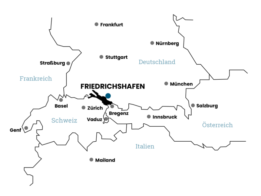 Aber auch als Tourismus-Region hat der Bodensee eine zentrale Bedeutung: Jedes Jahr verbringen Millionen Menschen hier ihren Urlaub – entsprechend leistungsstark ist die Infrastruktur. Als Mobilitäts-Zentrum in der Bodensee-Region ist Friedrichshafen gut per Flugzeug, Auto oder Bahn erreichbar.