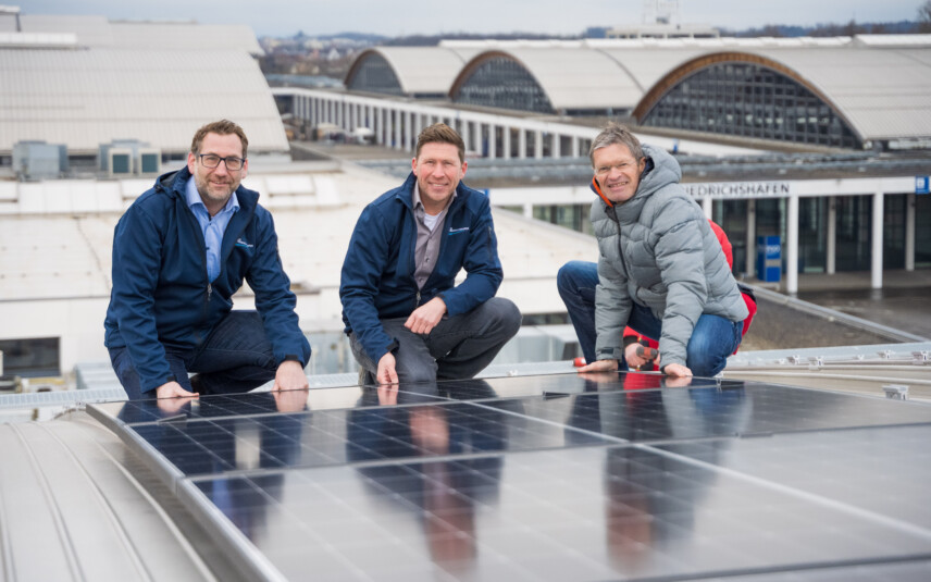 Einen bedeutenden Schritt in Richtung Nachhaltigkeit macht die Messe Friedrichshafen mit der Installation der größten Photovoltaik- Dachanlage in der Bodenseeregion: Zukünftig wird das Unternehmen einen Großteil seines Strombedarfs selbst decken. Auf einer Fläche von 25.000 Quadratmetern werden 12.350 PV-Module installiert, die eine Gesamtleistung von bis zu 5,5 Megawatt Peak erreichen.